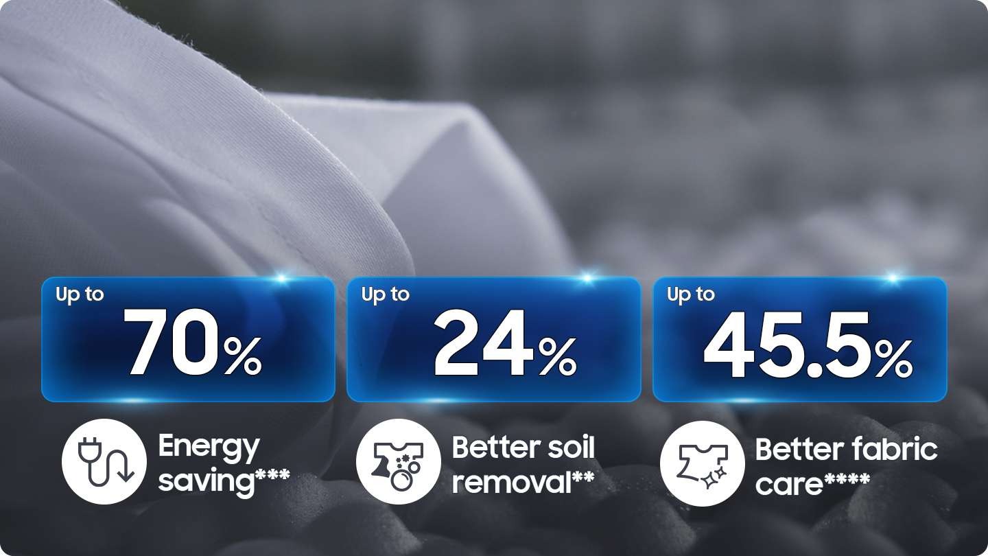 Активируйте режим AI Enegry*, чтобы снизить расход энергии до минимальной для приложения, которую вы выбираете**. Контролируйте свои расходы с Samsung и позвольте вашей стиральной машине сэкономить до 70% энергии*** с режимом AI Enegry и технологией EcobubbleTM.