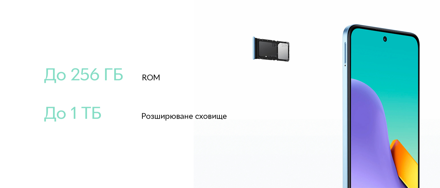 Redmi 12 5G має максимальну ємність 256 ГБ. Завдяки розширеному об’єму пам’яті до 1 ТБ Redmi 12 5G дозволяє легко зберігати всі потрібні фотографії, відео та файли, куди б ви не пішли.