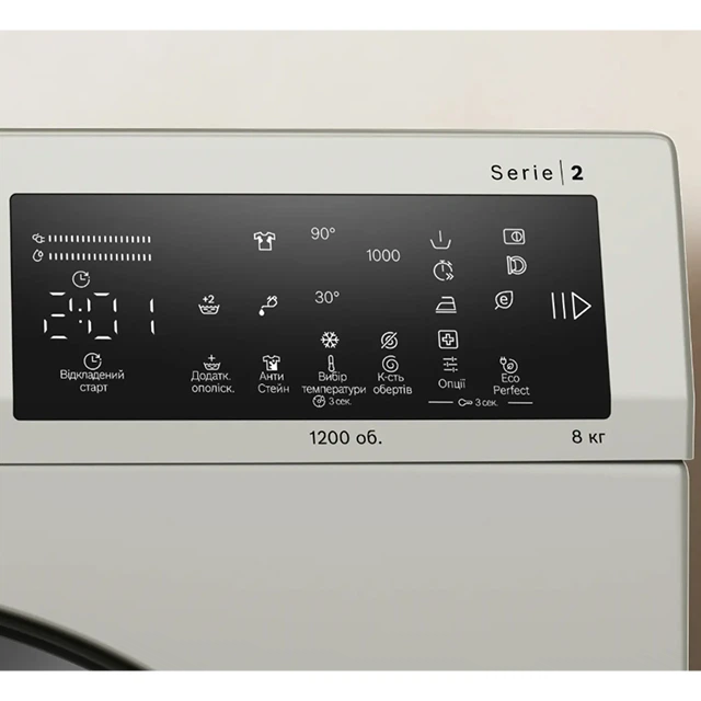 На великому світлодіодному дисплеї чітко відображено хід програми, обрані додаткові опції, рівень температури, кількість обертів віджимання, залишковий час прання, відтермінування старту програми на 1–24 години та рекомендації щодо завантаження. Сенсорні кнопки вибору додаткових опцій моментально реагують на ваш дотик та роблять керування пральною машиною зручним та надзвичайно приємним.