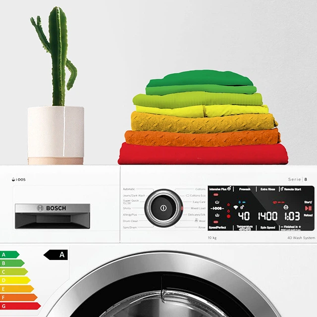 Під час придбання побутового приладу слід враховувати його показники споживання енергії та води. Енергетична етикетка вказує клас ефективності, рівень шуму, об’єм завантаження, споживання енергії та води пральною машиною. Найсуттєвішою зміною в нових енергетичних етикетках є скасування класів енергоефективності «плюс», як-от A+++. Нове маркування – це діапазон від A до G. Завдяки високоефективній системі енергоощадження ця пральна машина Bosch досягає класу енергоефективності A без компромісу щодо результатів.