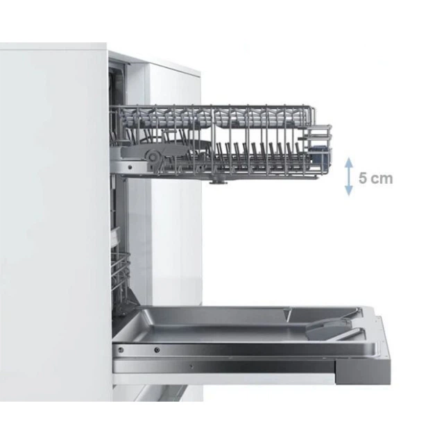 Верхній короб обладнаний потрійною рейковою системою, завдяки чому можна регулювати кошик по висоті до 5 см. Це дасть змогу розмістити високі тарілки чи інший посуд. А головне, регулювати висоту можна, коли короб вже повністю завантажений!