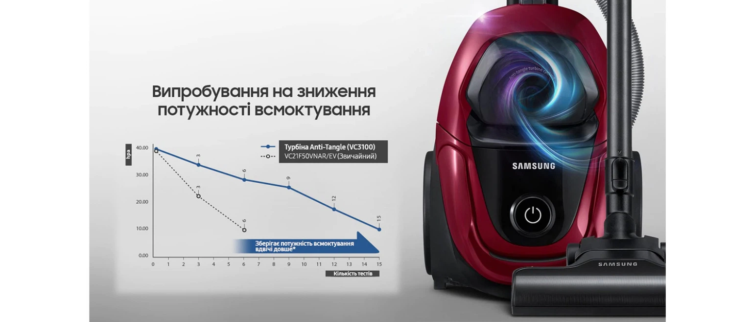 * На підставі внутрішніх випробувань. Випробування турбовентилятора проводилися на підлозі, покритій волоссям і шерстю домашніх тварин. Порівняно зі звичайною моделлю Samsung VC21F50VNAR/EV.
