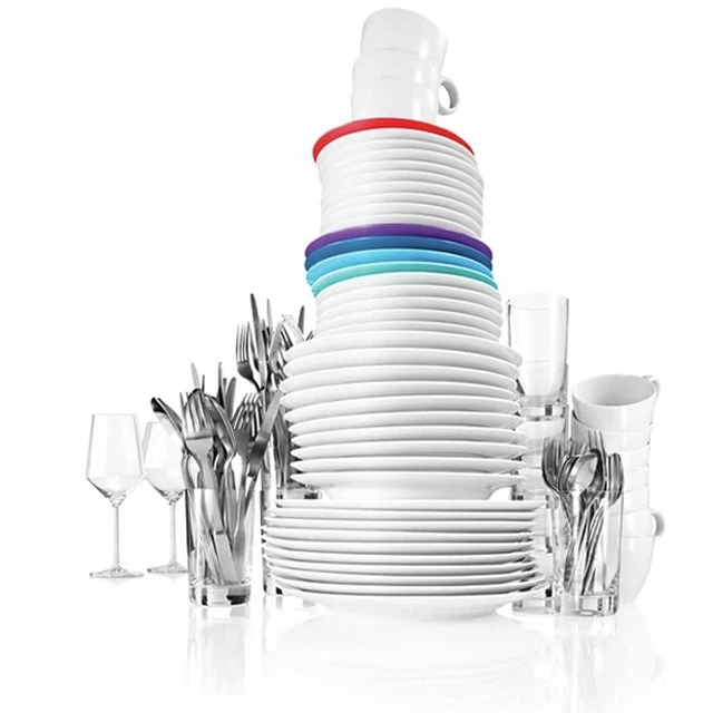 Завдяки системі RackMatic верхній короб можна регулювати за висотою між трьома позиціями. Ця система дозволяє легко звільнити додаткове місце для високих предметів посуду, як-от тарілок для піци чи келихів на високій ніжці, у верхньому або нижньому коробі.