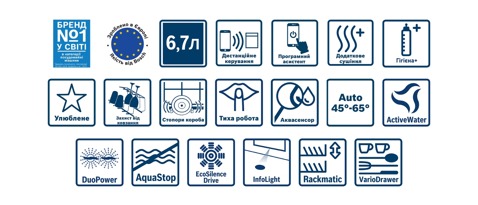 * Найменше споживання води серед посудомийних машин Bosch.