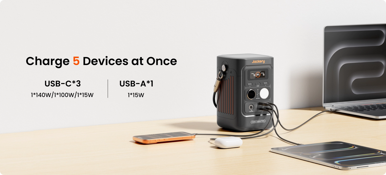 Ця легка зарядна станція вагою 2,5 кг , що забезпечує 288 Вт·год енергії — що еквівалентно до 9 портів зовнішнього живлення — з максимальною вихідною потужністю до 300 Вт , має 3 порти USB-C, 1 порт USB-A та автомобільну розетку , що дозволяє одночасно заряджати ноутбуки, дрони та кілька інших пристроїв для подорожей, кемпінгу та щоденного резервного копіювання.
