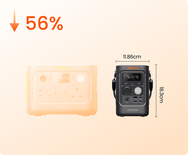 Вага DC Explorer 300D становить лише 2,5 кг, а його розмір до 56% менший , тому його легко носити однією рукою. Він до 64% менший і на 39% легший, ніж середні по галузі електростанції змінного струму такої ж потужності.